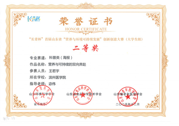 本届山东省“营养与环境可持续发展大赛”由全省各会员单位共评选推荐309个作品,全省前5%获评一等奖,前15%获评二等奖。参加各类学科竞赛是培养学生专业综合能力的重要途径,我院高度重视学生实践创新能力培养,积极鼓励学生参与各类学科竞赛,以赛促学、以赛促教。此次大赛中,我院学子凭借扎实的专业知识、创新的思维模式和出色的实践能力,在众多参赛作品中脱颖而出,不仅为个人赢得了荣誉,更为学院争得了光彩。同时,学院作为协助承办单位,在赛事组织、服务保障等方面也做出了积极贡献,得到了主办方和与会专家的一致好评。未来,学院将继续加强与各界的交流合作,为学生提供更多展示自我、提升能力的平台,助力学生成长成才。