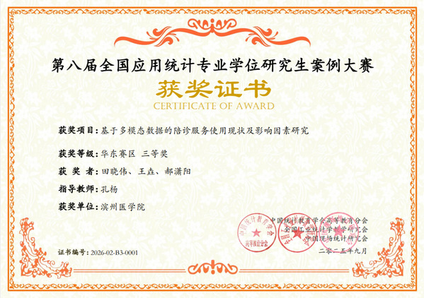 全国应用统计专业学位研究生案例大赛是在全国应用统计专业学位研究生(MAS)教育指导委员会指导下,由中国统计教育学会高等教育分会、全国工业统计学教学研究会、中国现场统计研究会主板的全国性比赛,是面向全国相关学科研究生的重要学术竞赛,旨在鼓励学生运用统计方法解决实际问题,提升实践应用与创新能力。此次获奖,充分展现了我院在应用型人才培养方面的成效,也体现了卫生管理学院在学科交叉与实践教学方面的积极探索。