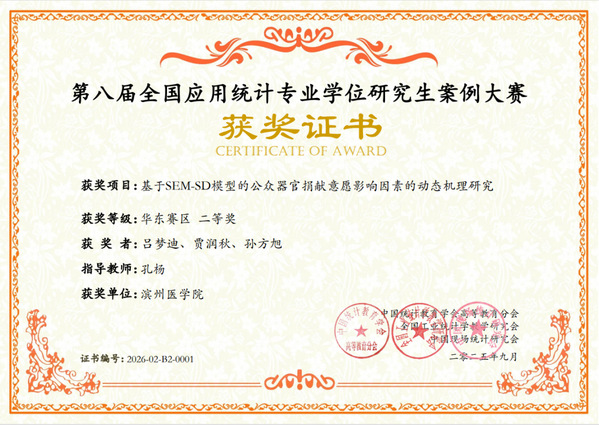 由吕梦迪、贾润秋、孙方旭组成的团队凭借《基于SEM-SD模型的公众器官捐献意愿影响因素的动态机理研究》项目荣获华东赛区二等奖;田晓伟、王鑫、郝潇阳组成的团队以《基于多模态数据的陪诊服务使用现状及影响因素研究》项目荣获华东赛区三等奖。两支团队均在孔杨教授的指导下完成参赛项目,体现了学院教师扎实的指导能力和学生良好的团队协作与科研创新能力。